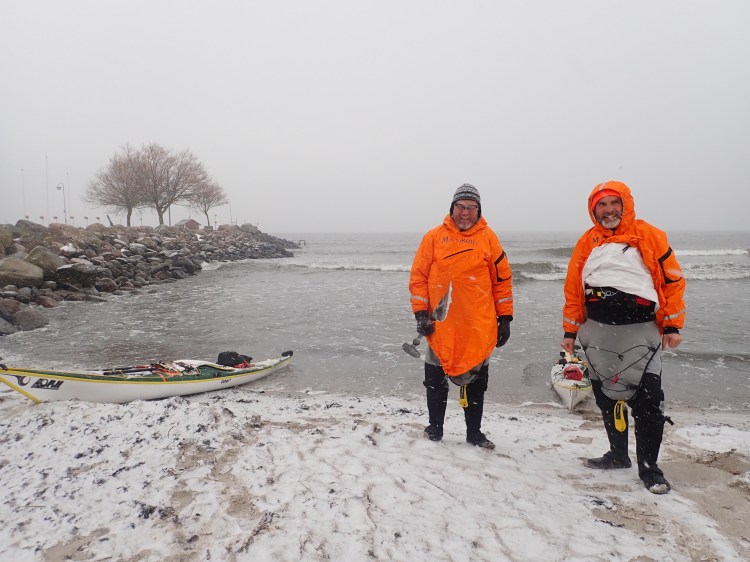 For a week it has blown gale force winds there. Tomorrow we should get about 7 m/s tailwind. That’s an opportunity we cannot let pass. So we paddled today in falling winds and thick snow. Couple of hundred meters visibility. Ystad came out of the snow as a surprise and disappeared back into the snow in 20 min or so. A long slog followed paddling into a white wall with never-ending white land to port.