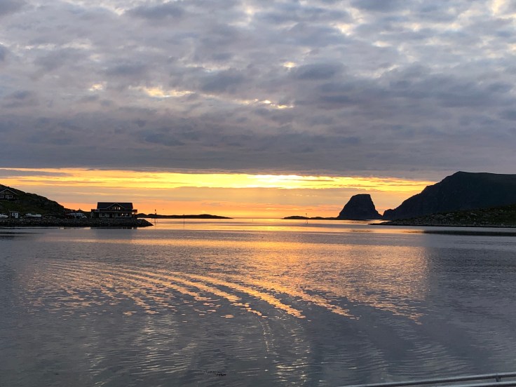 Just as we paddled into Gjesvær harbor a small gust of the forecast wind shoved up, but now at 2300 it is dead calm again