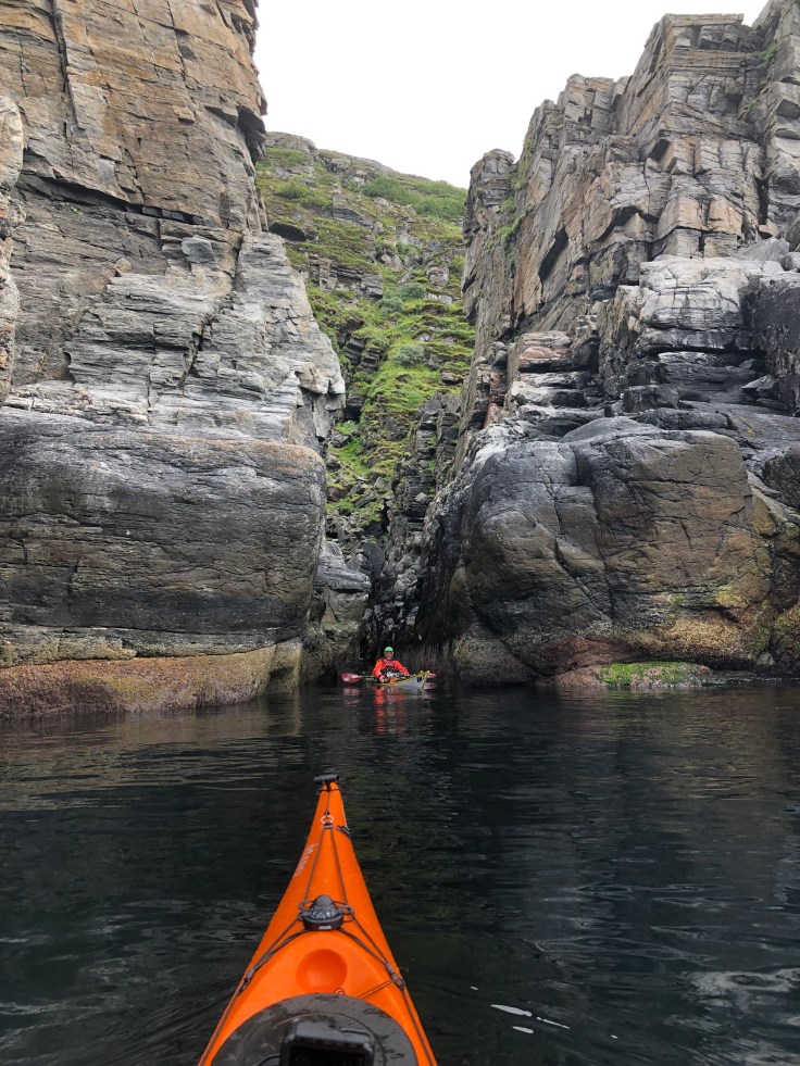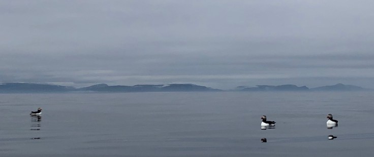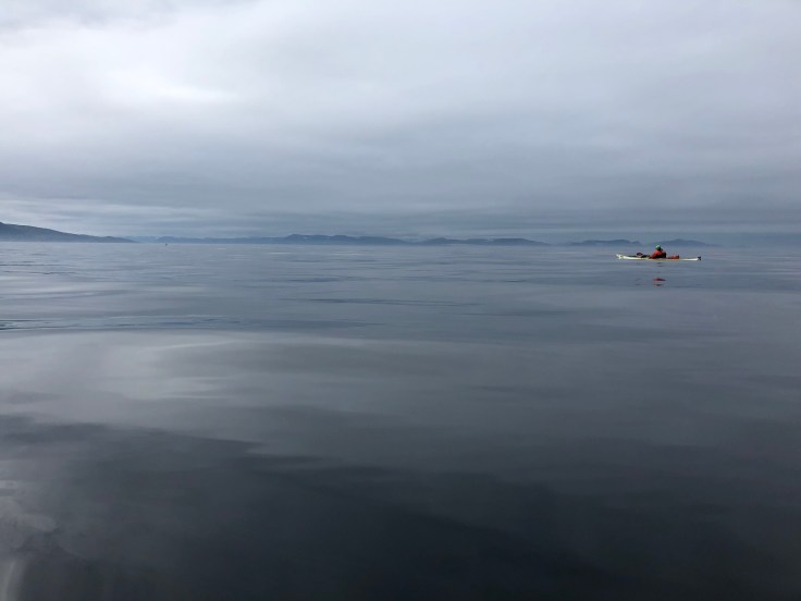 Again it was 1115 before we were on the water. First leg became a 28 km 4 3/4 hour crossing to get to the northern part of Kvaløya. It may sound boring, but we paddle through small flocks of seabirds and the occasional whale will come up to blow. And the conditions were superb. No reason to worry about rain when you are in a dry suit. We were on the alert for changes in weather. Poor cell phone coverage meant that we only had the forecast from yesterday.