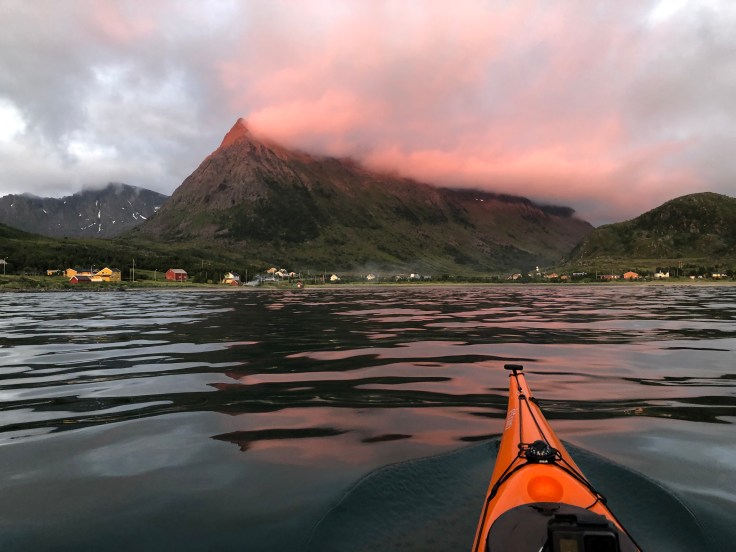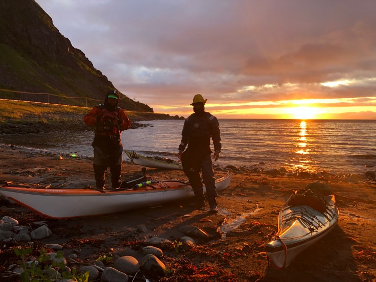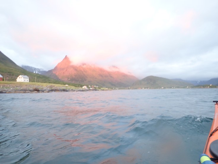 By now it was 2130, so time for lunch. We spent the lunch break studying the weather forecast at yr.no. As we crossed Øksfjord we could see the waves moving along the horizon on Lopphavet. The horizon isn’t far away when your eyes are 80 cm above the water, bu still those were sizable waves and Lopphavet is an infamous stretch along the coast. So good reason to study the weather forecast.
