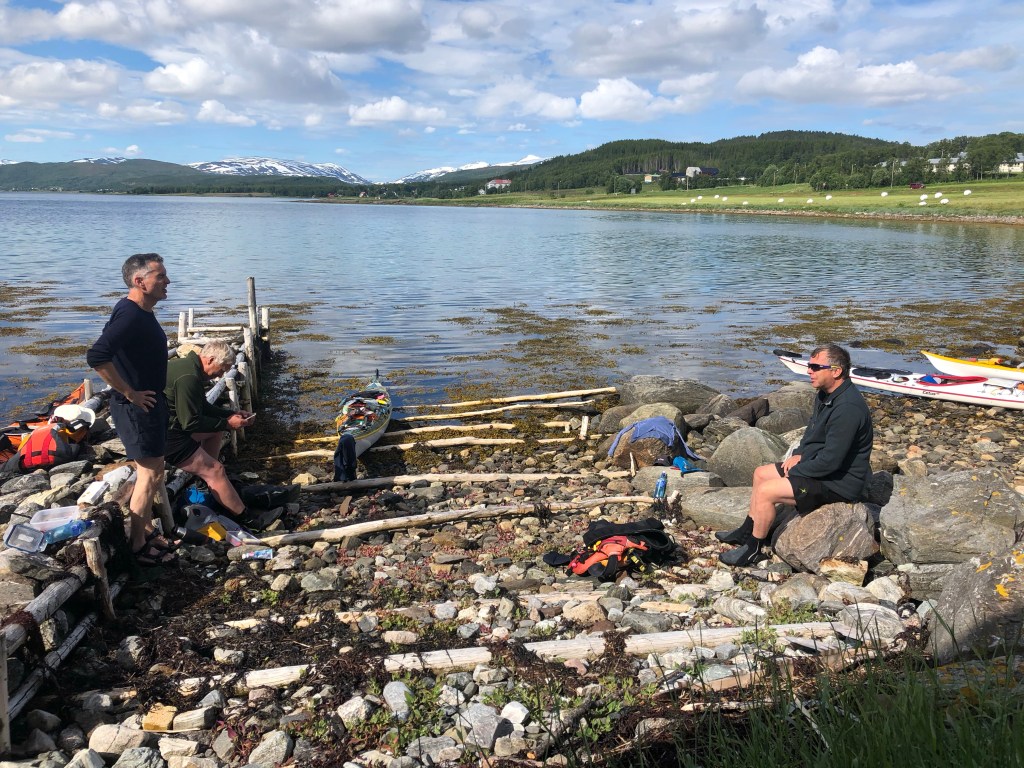 Gibostad toward Finnsnes started with another long slog along the shipping lane, the water was wider and we had no problem staying clear as Hurtigruta passed. The head wind and currents continued. Stein had studied the current conditions and there was hope that a following current should appear sooner or later. As far as we can tell it was never. Just as we saw the bridge at Finnsnes we decided we needed an out of plan break. Good choice. We enjoyed the last sun of the day on a pebbly beach. We all agreed that the quality of the breaks is as important for a successful trip as the paddling speed.