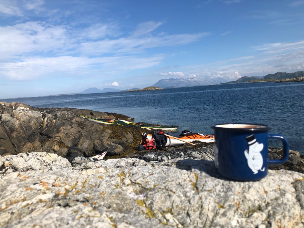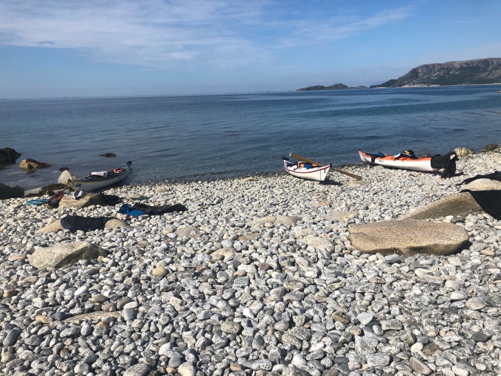 We followed shortest distance and kept to two shortish breaks. The last of those at Fjordholmen (or Buholmen) at a fantastic pebble beach, shelterd from the wind, sun shining and air temperatures of 20 plus. We were tempted to linger, but we had three hours to go to Brønnøysund where Hilde Rønnaug Berntsen was expecting us. She had promised us a dedicated cook and a three course dinner at Tørrfiskbrygga, where Brønnøysund Sjøsportklubb is housed.