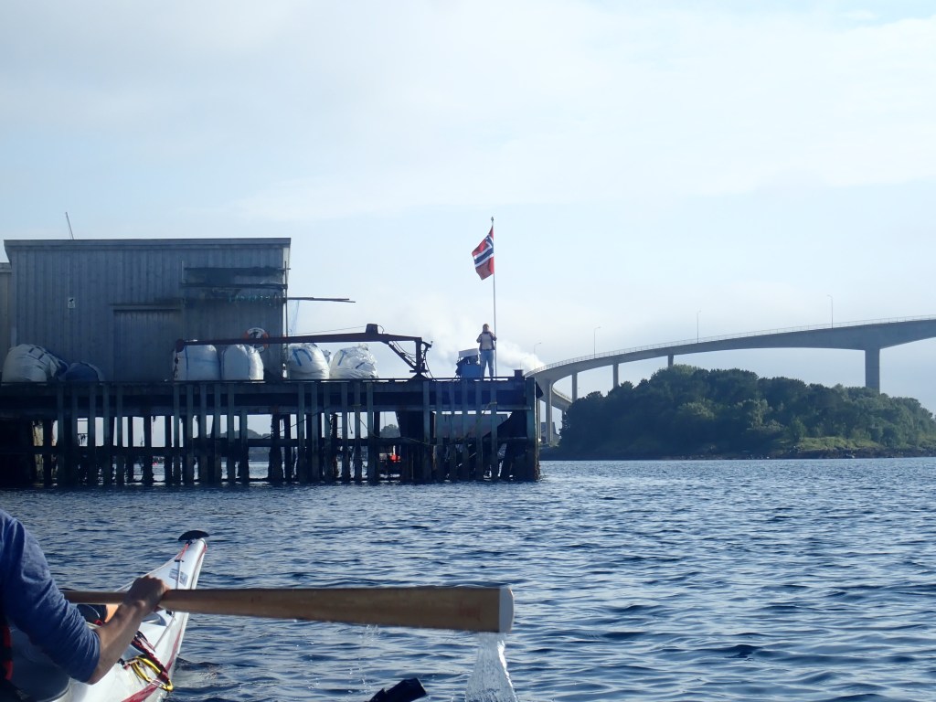 As we came into Brønnøysund we found Tørrfiskbrygga quite easily: Hilde was flying the flag:-) and to make absolutely sure we didn’t miss it Viggo Karlsen came rowing out to guide us the last few meters. No one rows a Nordlandsbåt faster than Viggo, and he has the biceps to show for it. He volunteered those muscles to help carry our boats into the boat hall.