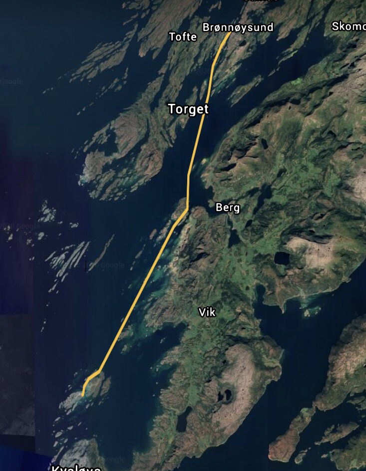 Brønnøysund to Lislvågøya 25.5 km, 6.1 km/hr average speed. Start 1515 arrive 2015