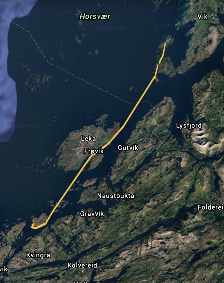 Lislvågøya to Gjerdingen. 49 km, 6.4 km/hr average speed. Start 1015 arrive 2015.
