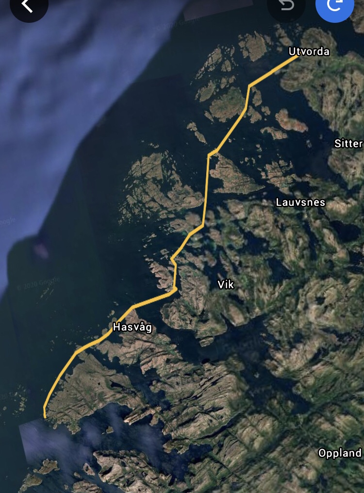 Utvorda to Sønnaholmen. 35 km, 4.5 km/hr average speed. Start 1030 arrive 1930