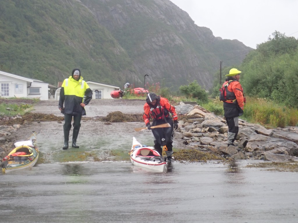 The weather was better in the morning, but not good. Still we decided to try to get some km out of the day. But first we had breakfast with our German friends. Then we went down to the reception to put on dry suits and pack the boats.