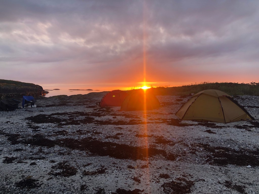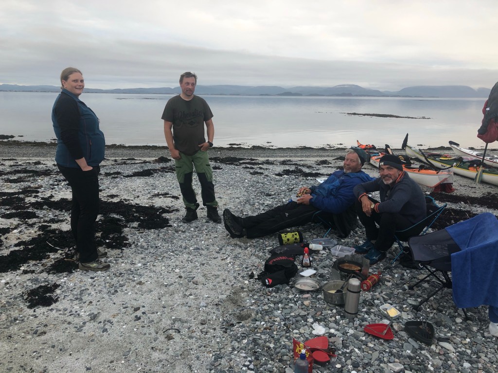 Tomorrow we will paddle to Sandstad on Hitra. WP, and it looks good. From there Erling will leave to visit Ålesund to take part in his uncle’s 70ieth birthday party, returning Sunday. By then Stein will have left for Oslo on Saturday. Which means Karianne will be left to look after the gear. Possibly a superfluous function, since no one in their right mind and a sense of smell would take anything….