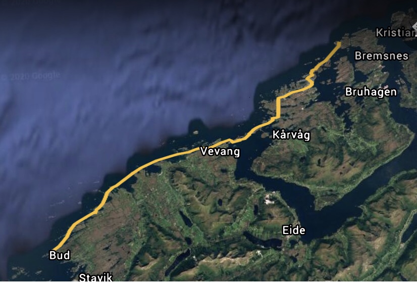 Sveggen to Bud. 47 km, 6.0 km/hr average speed. Start 0925 arrive 1830.