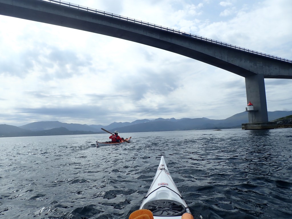 After a couple of hours we got sight of Atlanterhavsvegen. Now we were into more open waters. We paddled in behind the road and found some shelter for the wind for a lunch break.
