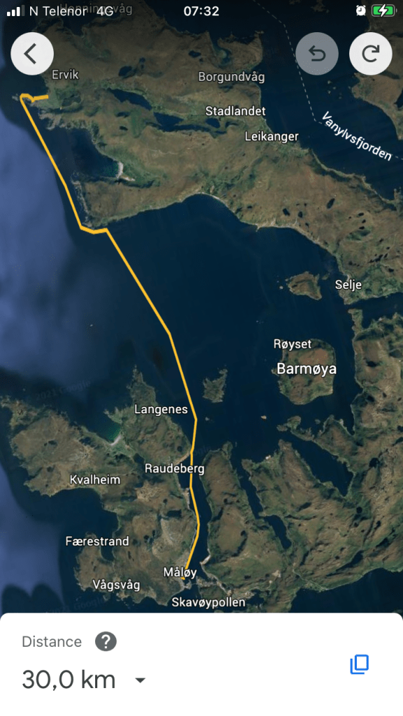 Ervika to Måløy. 30 km. Start 1110 arrive 1630.