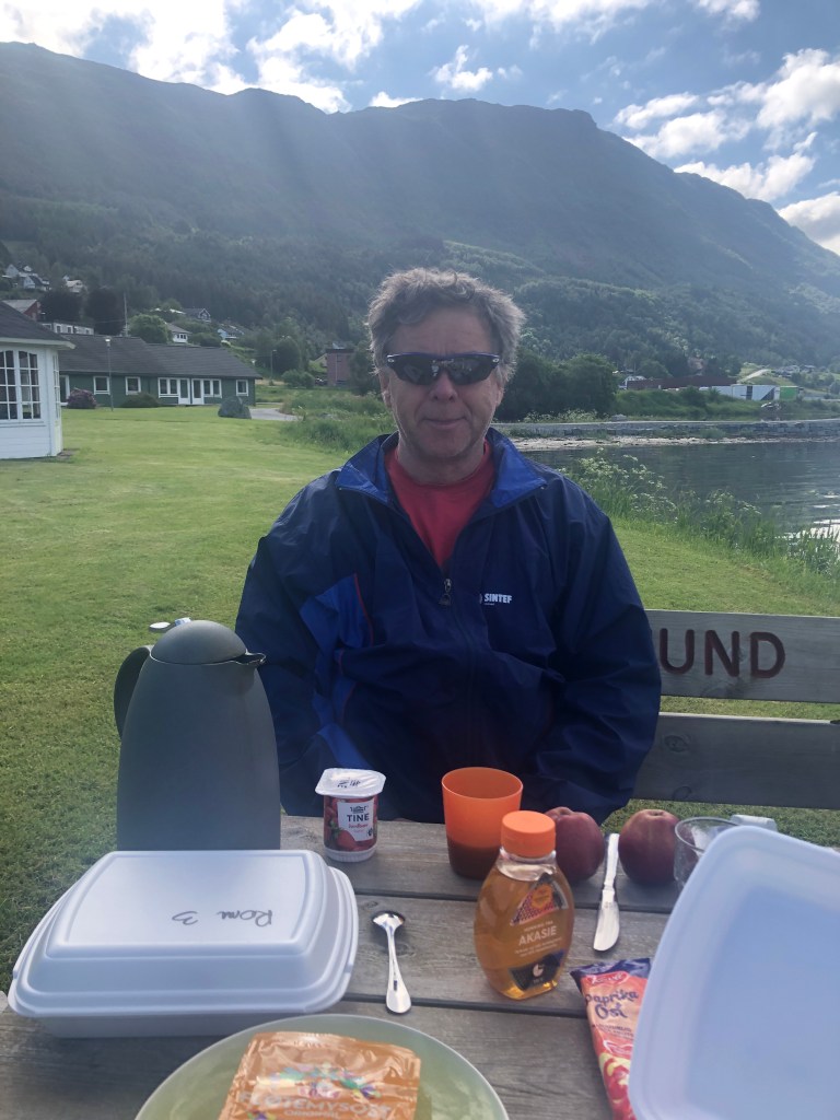 Soon the Måløy bridge was in sight and not long after that someone was waving from shore: It was Stein. He and Arne had just arrived after having spent the night at a refurbished “old people’s home” in Åheim(!)