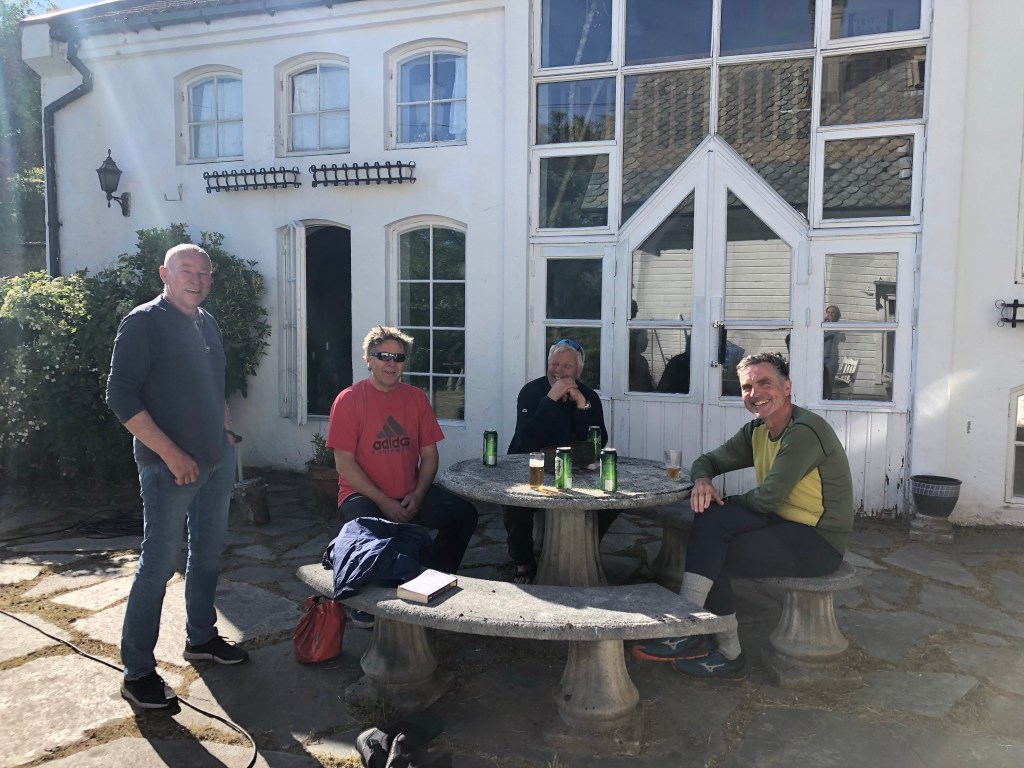 After a leisurely couple of hours on the patio, it was time for dinner in the grand dining room in the extension. Since our friend Torbjørn had arrived and neighbour Eigil, we were nine for dinner. The menu was a maritime mix, salmon and some of Erling’s father’s fish cakes, none the worse after three days in a kayak.