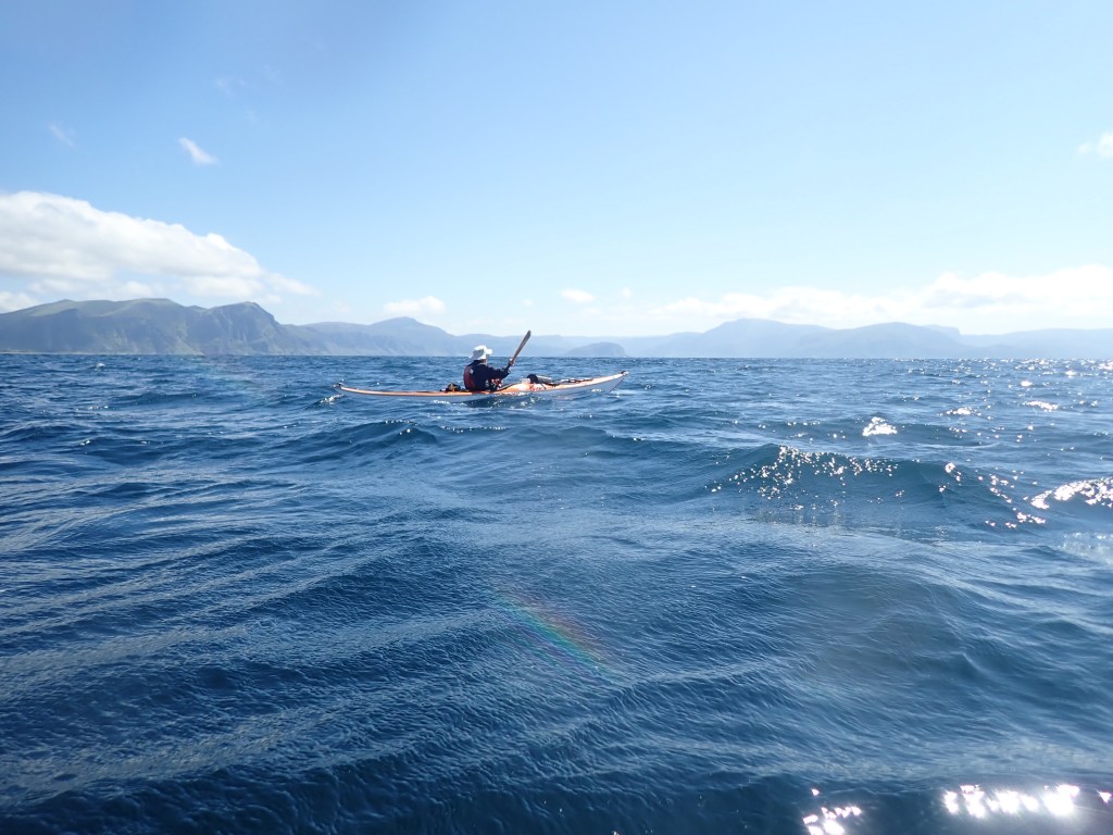 Our plan was to break at Ytre Fure before crossing the ca. 10 km wide Sildegapet. As we came to the start of Sildegapet conditions for crossing were optimal. Light tail winds and the sun shining from a clear sky. These ideal conditions might not last; on sunny days around here means that the wind will pick up in the afternoon. So rather than break and risk having to wait until the evening to get across we decided to just cross without any delay