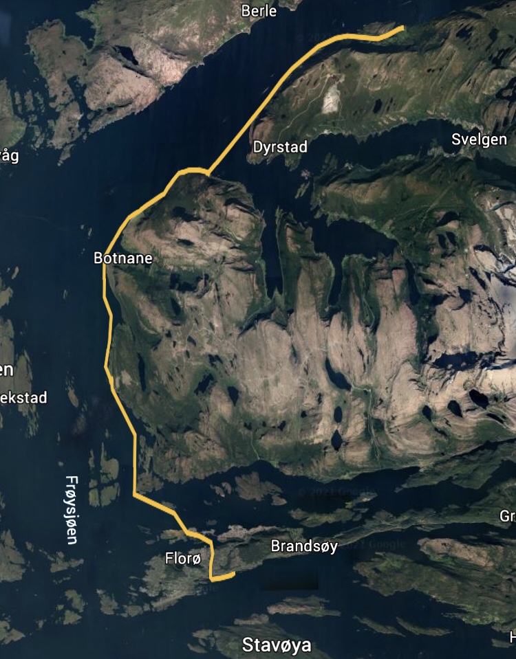 Hennøy to Florø. 36 km. Start 1120 arrive 1955. 5.8 km/hr average speed.