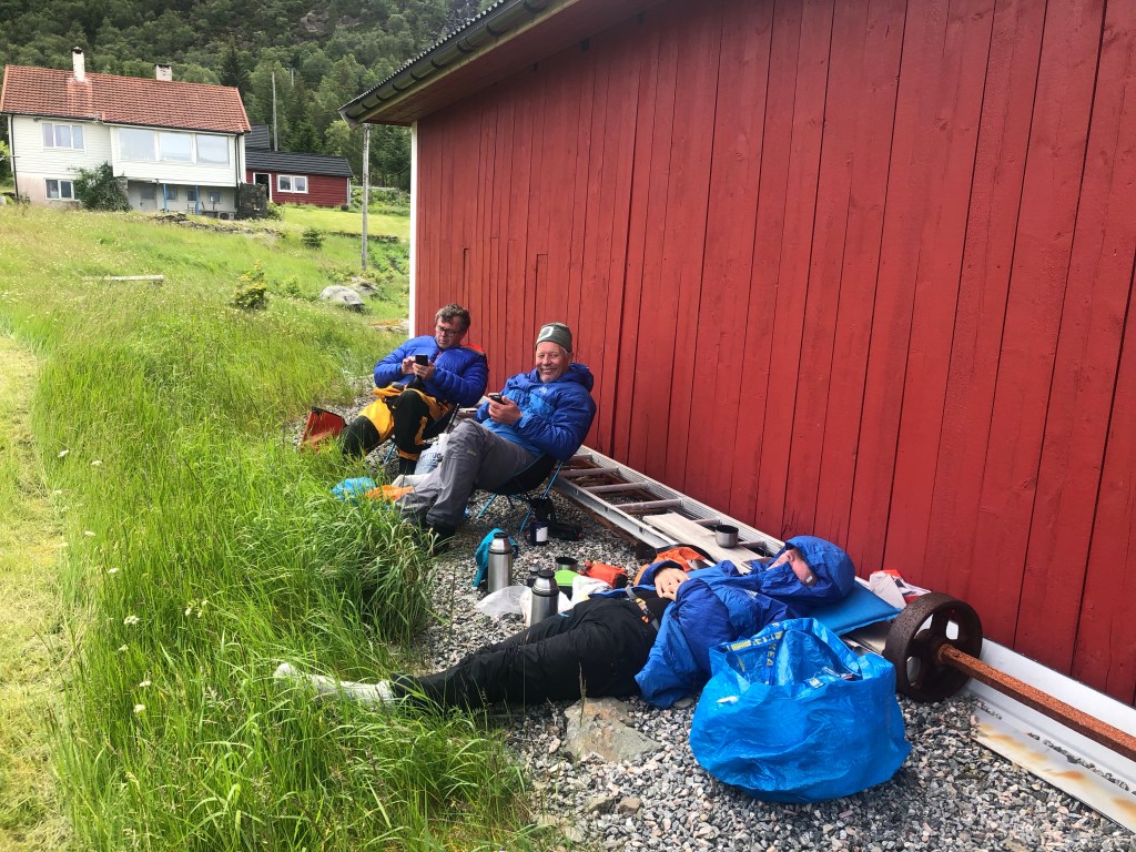 At Gulestøa the winds had picked up, and we decided on a long lunch break. On with dry clothes and resting sheltered from the wind behind a boathouse.