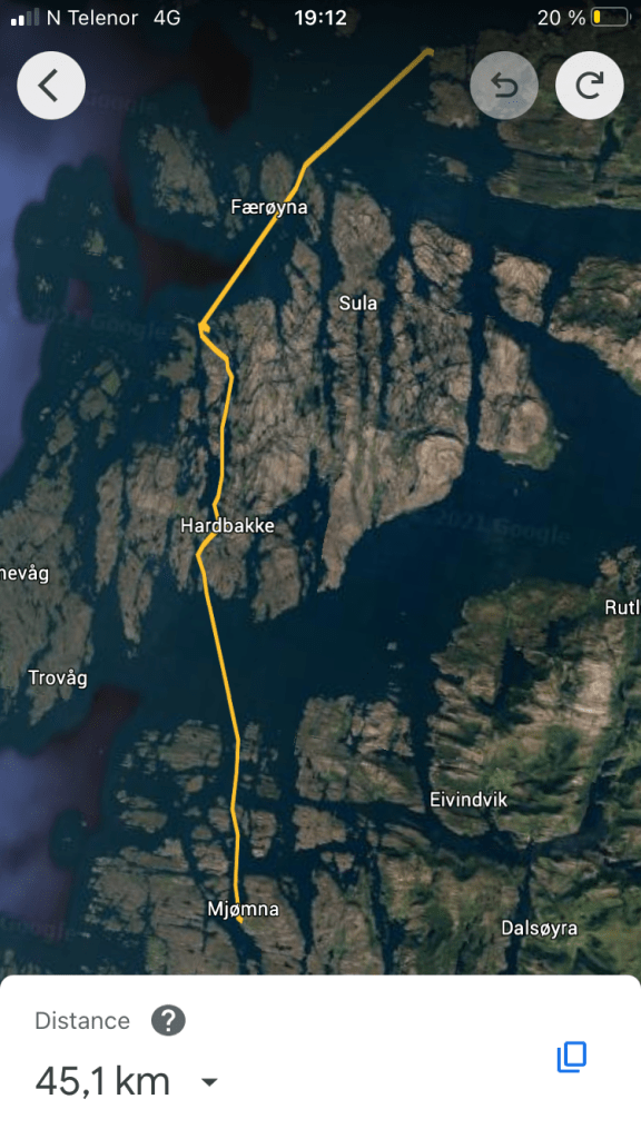 We managed to get to the inlet towards Hardbakke just about in time. And then an easy stretch into Hardbakke with strong tail winds and no waves. We got to Hardbakke just in time to persuade the Spar groceries to keep open 15 extra minutes (to 1515). We were running low on provisions (and we craved ice cream)