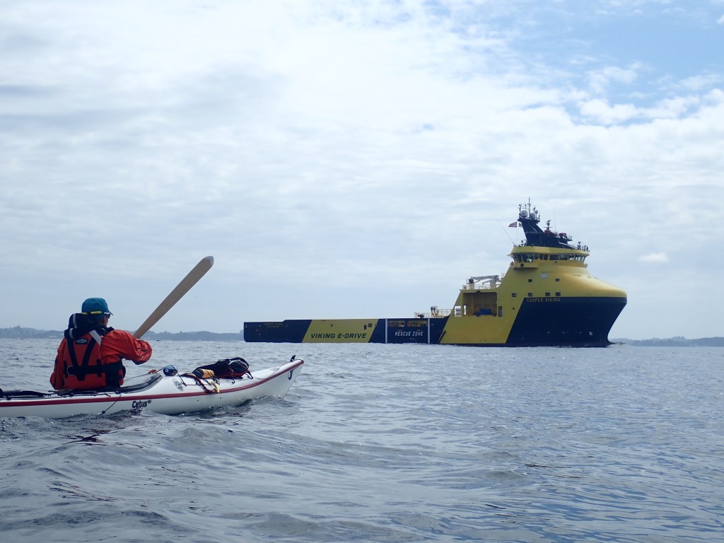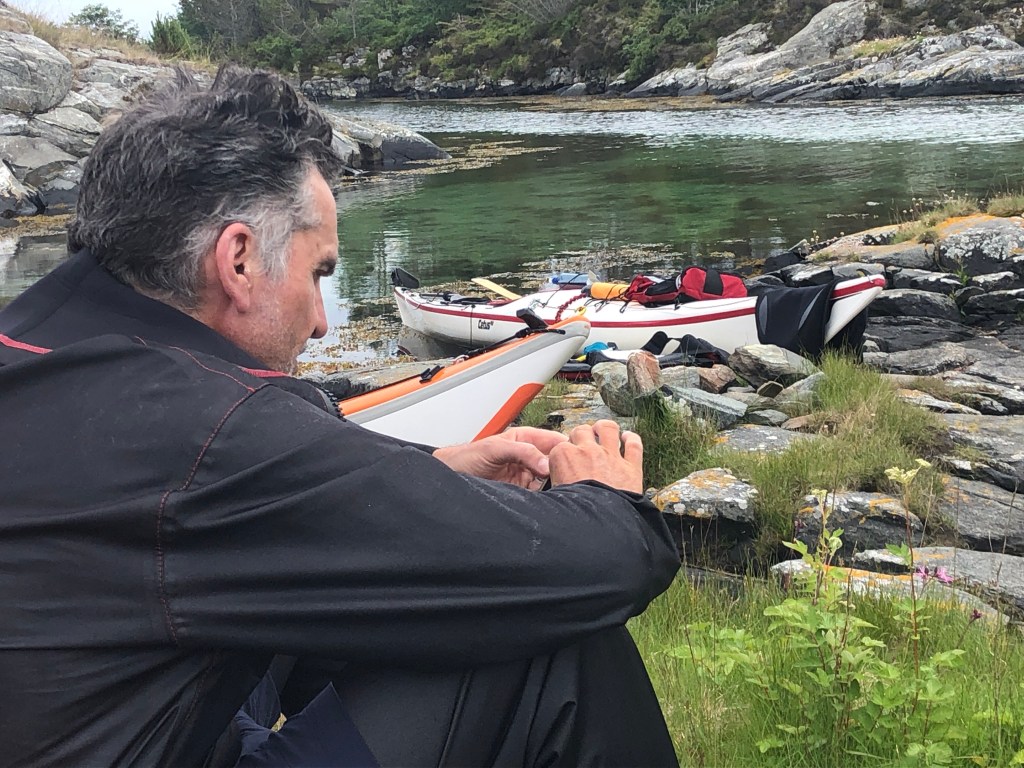 Geology aside, we were very happy with the site. Stein has paddled here twice before and he has experienced difficulty finding good campsites along this part of the coast. “Mr Google maps” (Erling) is also struggling, so tomorrow (Monday 28) the plan is to paddle about 30 km to a conveniently placed “Joker” store at the east side of “Lille Sotra”, buy ice cream, and take it from there. WP
