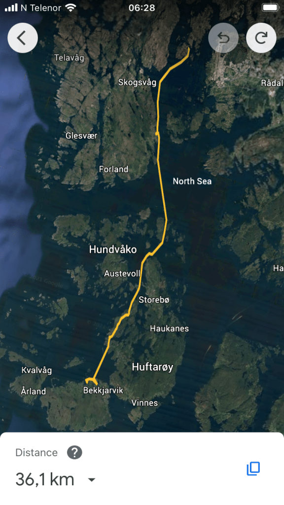 Tyssøyna to Bekkjarvik. 36 km, start 1140 arrive 2145. Average speed 6.4 km/hr.