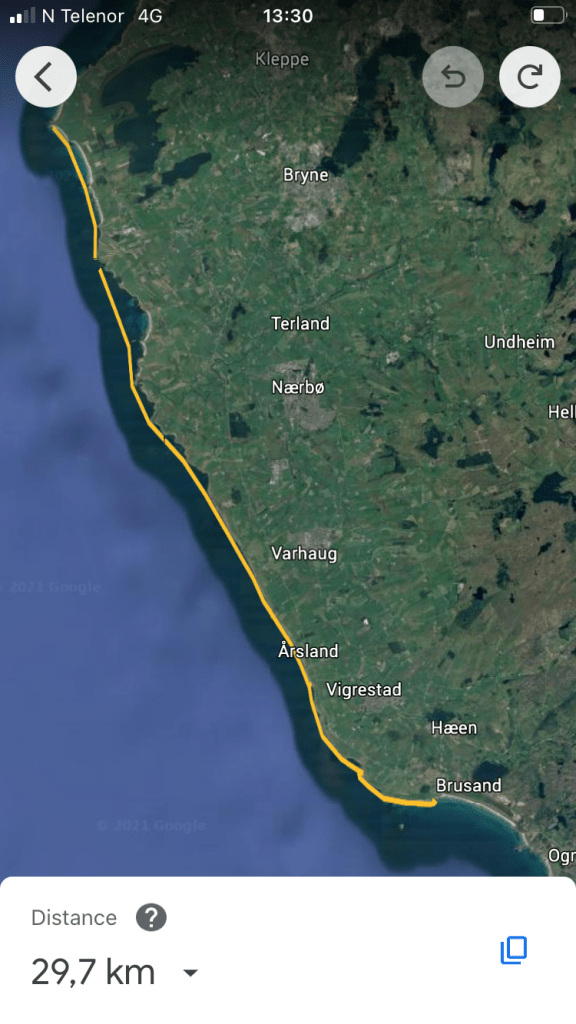 Søre Revtangen to Brusand. 30 km. Start 0915 arrive 1715. Average speed: Slooow