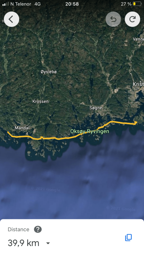 Juvika to Bergeneneset (Mandal to Kristiansand) 40 km. Average speed ca 5 km/hr. Start 1040 arrive 1910
