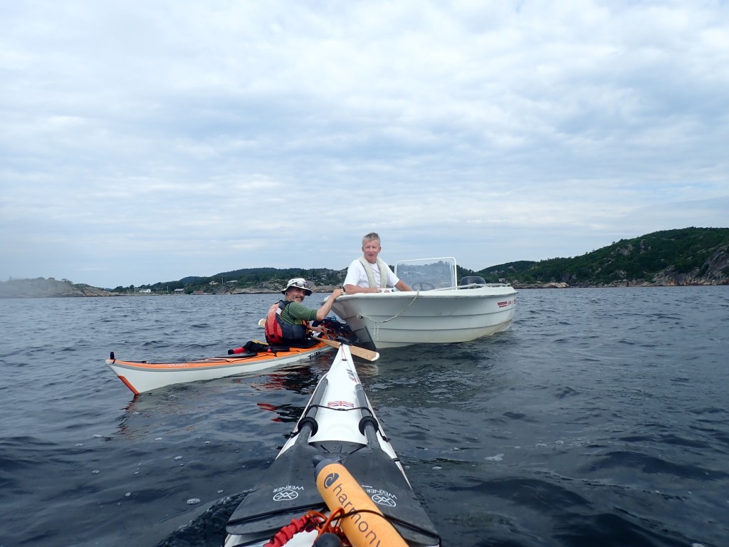 Erling had sent an sms to a colleague he believed had a summer house at Skjernøya just a few km along the way. But soon we were approached by a small boat coming from the opposite direction! That was Øivind, who has a summerhouse at Hille which we passed yesterday…. Poor navigation or poor hearing or both from Erling.