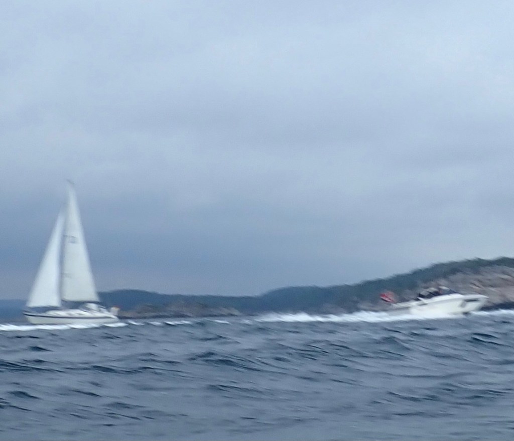 Next we crossed Torsfjorden. The most exposed part of the day. Now the wind had picked up to maybe 7 m/s ( as the forecast said) so it was a hard hour or so of slow paddling. But the main issue was a steady stream of about 50 feet cabincruisers. This was a much more busy shipping lane toward Ulvøysund than the one into Kristiansand, and the boats were just as big, and much faster, and one has to assume the skippers less professional. Anyway we kept right of the shipping lane and had only one semi scare.