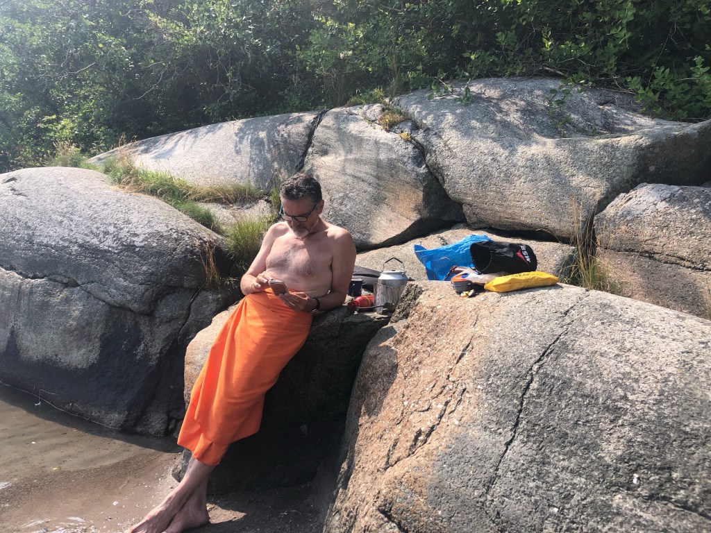 No time for breakfast except the two leftover Danish pastries from yesterday. We did take time for a quick kayak chat with our fellow campers from Bergen kayak club. They had come for the waves but stayed for the super summer.