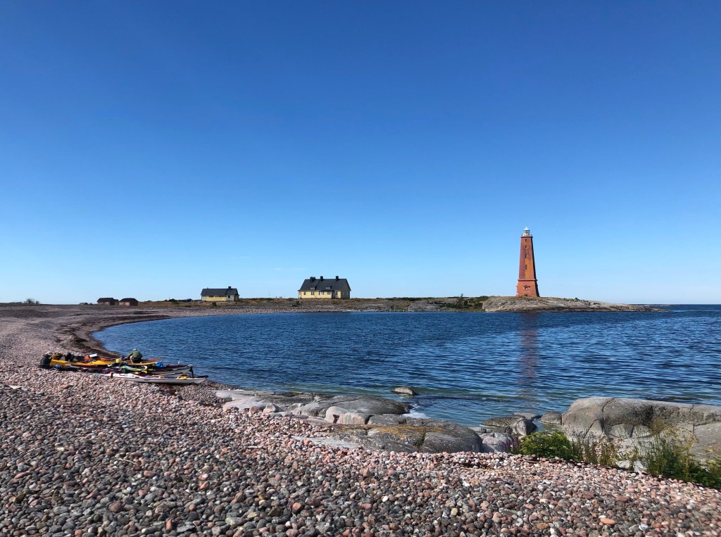 All went to plan. We could see the two lighthouses from about 2200 and onwards. We passed Fløtjan after four hours with no desperate needs suggesting a landing and at after six hours we set the kayaks ashore on the pebbly beach at Lågskär. We were in Finland!!