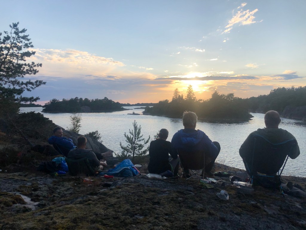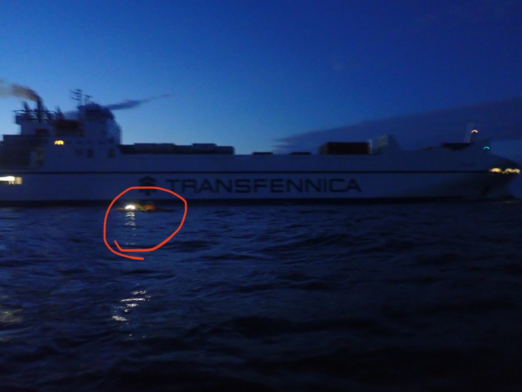 We did a bit of risk analysis. Main risk: a lot of boat traffic; we haven’t spent an hour at Tyvskär without one, more likely two or three large boats in sight. Mostly ferries crossing between Sweden and Finland and most going to the north of our planned route. But far from all. Mitigation: lights on all boats. Most of us use head torches, but Mikko went one better with and anchor light attached to the kayak. And then we carry two VHFs so we are able to communicate with nearby traffic.