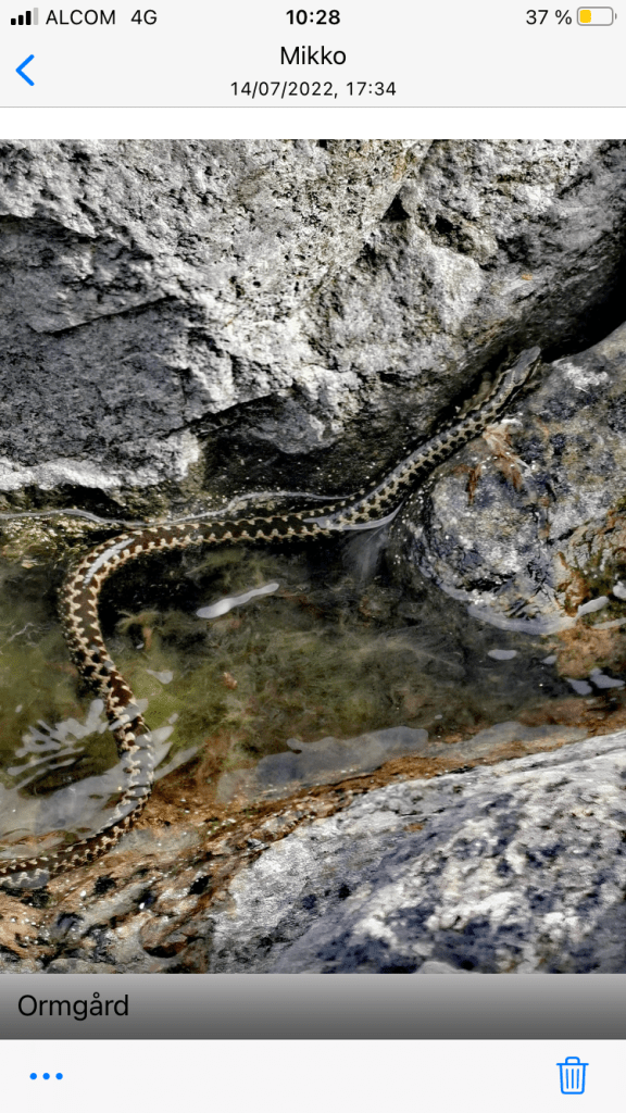 The wind was about 7 m/s tailwind and we made good and uneventful progress through the rocky archipelago. After about two hours paddling we had a break at Ormgård were we found some shelter from the wind. But it turned out “nomen was omen” as Mikko almost stepped on an adder. Close but no bite.