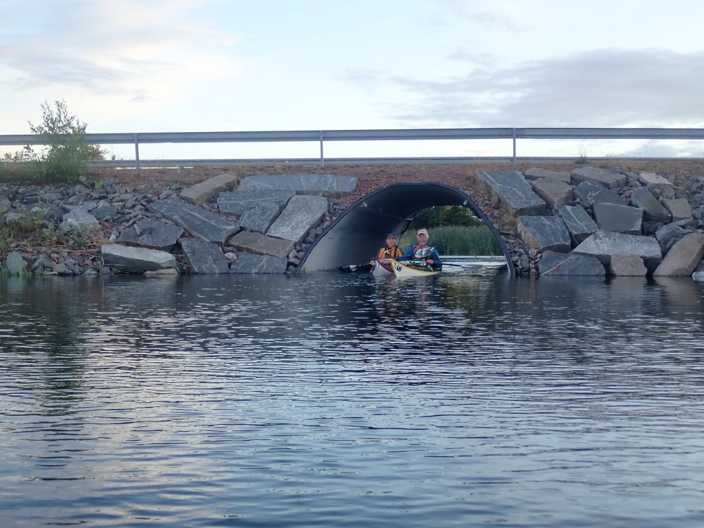 At the other end Mikko knew of an short cut through a pipe under a road. We found it and that saved us a couple of km. Just as well. We arrived at Sandvik Gãsthamn and camping at 2200 after more than three hours sat in the boats.